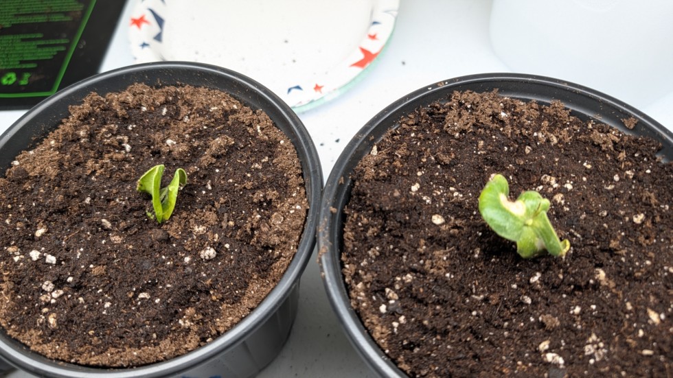 The cotyledons on both 2641 Paton plants are a bit messed up. One has brown spots in the center and the other holes. I don't know if this is a result of the seeds being damaged some on their trip here from the UK or what. Hopefully it won't be an issue.