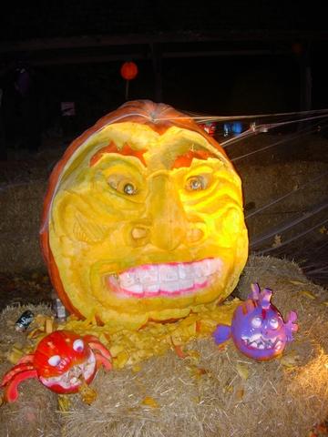 here is a 815 pound pumpkin this was grown my tomm beachy this carving took two hours to make posing next to the pumpkin is a purple fish and a red crab also made from pumpkins