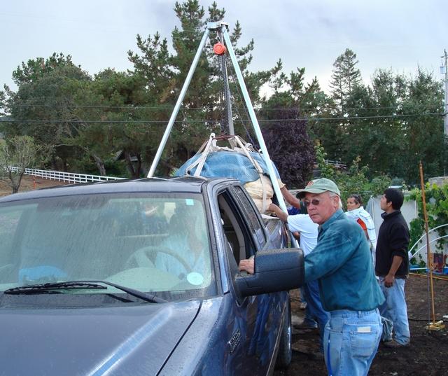 Gary Miller helps guide the truck back in.