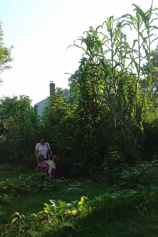 My mother and twin daughters standing next to some mixed tropical corn. Tallest is Tehua from Mexico.