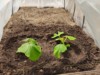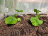 Planted the pumpkins in the hoophouse 20 days after sowing. On the right is 1266 Molek which is the main plant, and on the left a 1069 Wild. The molek has a double leaf but for now the tip looks normal with single leaves.