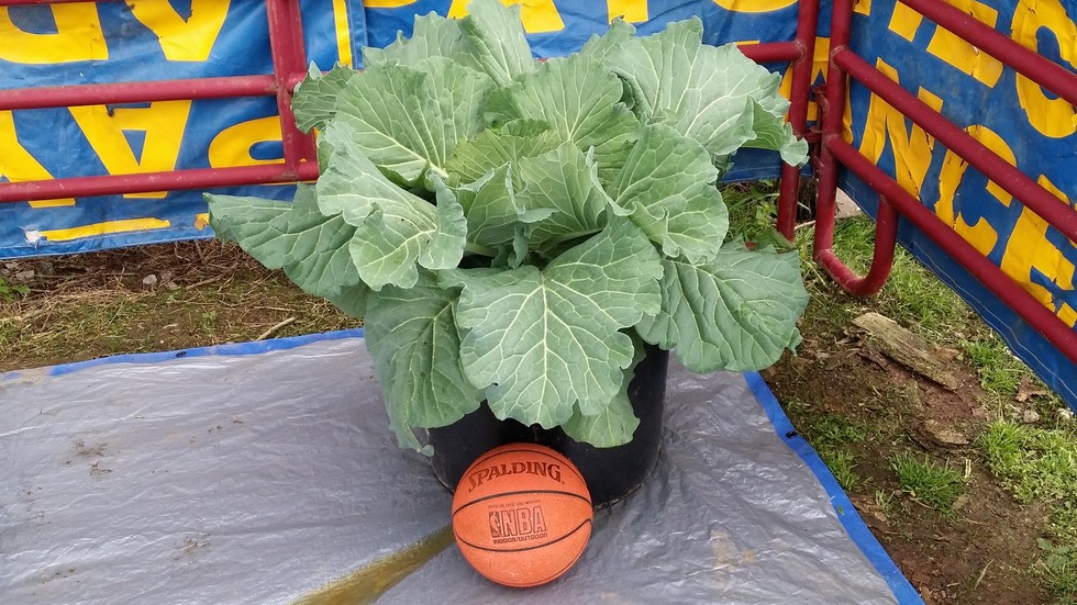 Hard to believe how big these plants get. Nearly 4 feet wide. I think the tub is big enough for the root ball but I don't know if it will get top heavy when the head develops. I moved the plants from full sun to a location near the barn where they will be in the shade from about noon and beyond. My concern is our heat in the afternoon. I'm watering 2 gallons a day at this point with some run out which is evident next to the basketball. This should keep the salt down from frequent feedings. No sure signs of heads yet. Leaves appear to be starting a head then they continue to unfold. I'm getting anxious and I don't know what to expect.