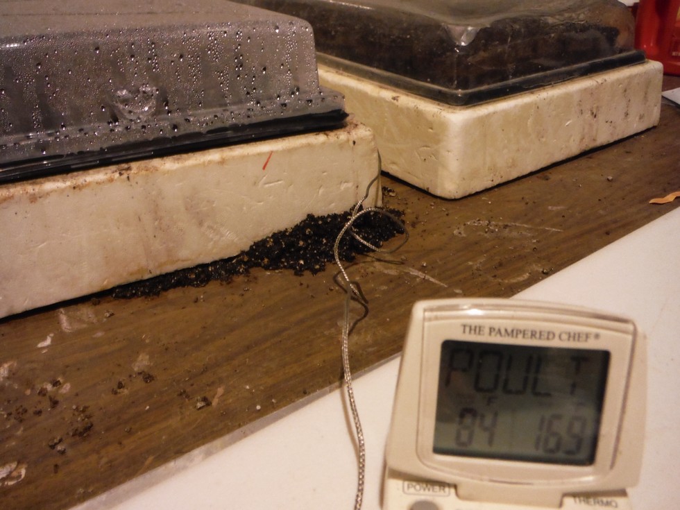 Ok I pulled the saran rap off the flats after 48 hrs I sprayed the tops with water & check the temp 79 degrees in the one & 84 in the other.I dont think 5 degrees means much.We will see which ones pop first? Will check every 12 hrs from here on out.Weather outside has turned cold and crappy high 50 And raining off & on.