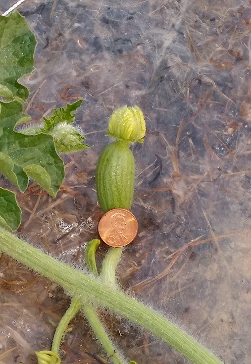 First melon pollination attempt of the year and it's on the 169. I've only had a couple females this size in past years. First one was open pollinated and turned out pear shaped. Looking back I wish I had selfed that plant for seeds. Other female was on the 165(B) in the hydroponic setup last year. This female had the male parts also. Plan was to very carefully snip them out and pollinate it with the 272 Neptune. As soon as I clipped the first little male part it fell onto the stigma and I could see pollen had been deposited. Fortunately I had covered males on this plant also so it has now been selfed. I used 2 males and re-pollinated 90 minutes later with 2 more. Fingers crossed!