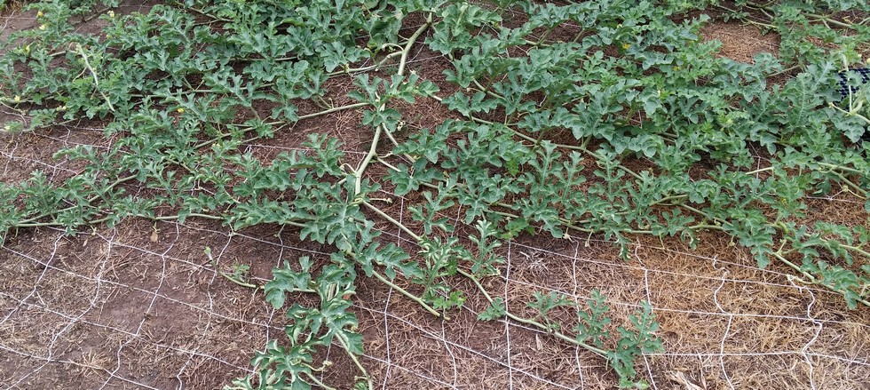 Decided to pull the plastic under the melon plants to see if that was causing excessive heat buildup under the plant. Since the plants were attached to the netting it was similar to pulling a table cloth from under china but much slower. Leaf curl continued UNTIL the rains set in. I inspected the bottom of the vines at the leaves and can't believe how quickly the older junctions started to sprout roots. If the melons take off I won't know if a 200 pounder could have been grown in the pool alone. Now I have to decide if I want to fertilize and water the bare area as needed. There's also time to try and set a good shape melon if good female comes along. Maybe aborting the mission is the best bet. I'll sleep on it.