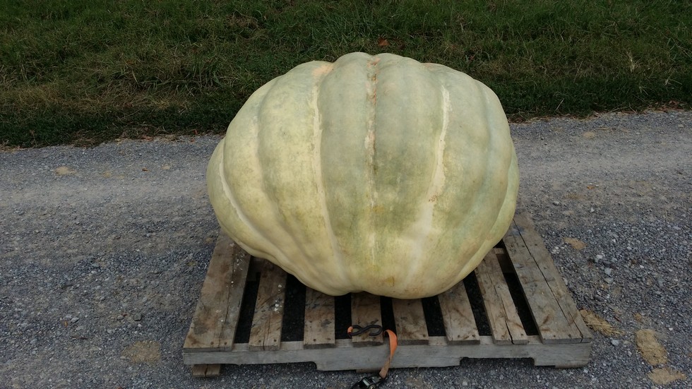 I had no intentions of hauling an open pollinated pumpkin along with the squash to Bear Wallow but when I walked by this one in the genetics patch I gave it a slap and it sounded different. I grabbed a pallet and off we went. Officially 548.5 Cantrell 15 (604.5 Cantrell 11 x open). She shows a lot of her squash background.