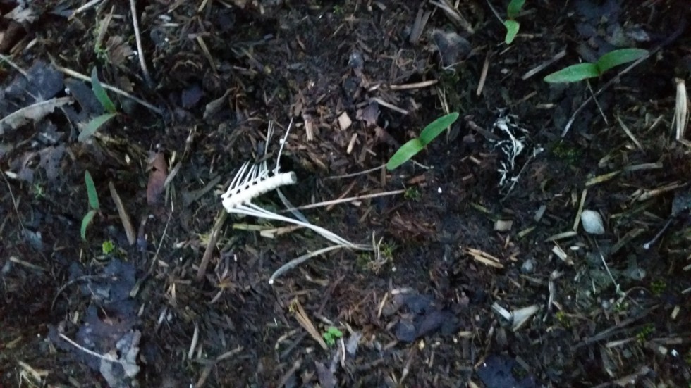 Last fall I buried several salmon carcasses in the new patch. Here are some bones peeking up from the soil. I was out last night getting my soil samples to send into the lab and found a few salmon bones here and there.