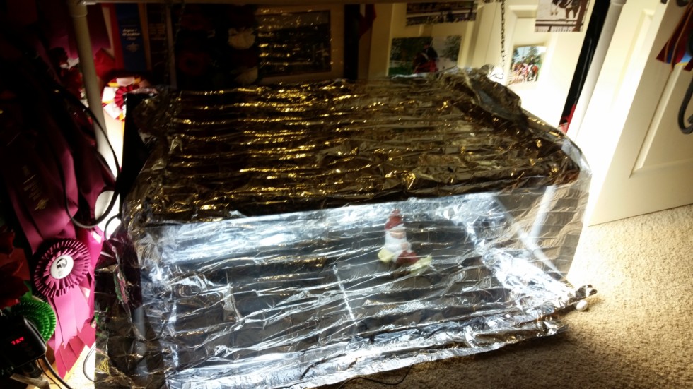 The bank of T5 red and blue spectrum lights are shrouded in reflective survival blankets. When the lights are on, you can see in.