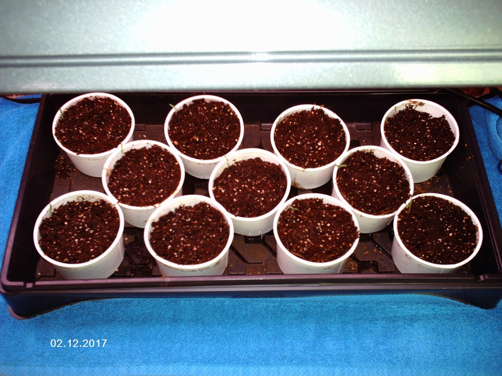 On the blue towel, I have thinned and deeply transplanted San Marzano tomato seedlings. I have also move them under my son, Christopher's, Performance Plus shop light. The heat mat is providing additional heat to the soil. Lesson learned here is to watch the seedlings as they sprout under clear plastic wrap. I didn't pay attention to this and the plants were spindly and looked like a cork screw. I lifted the seedlings with a clean fork and separated each seedling by holding the primary leaves to avoid pinching the vital tender stem. I finished this morning and checked again at 2 pm. So far, so good!