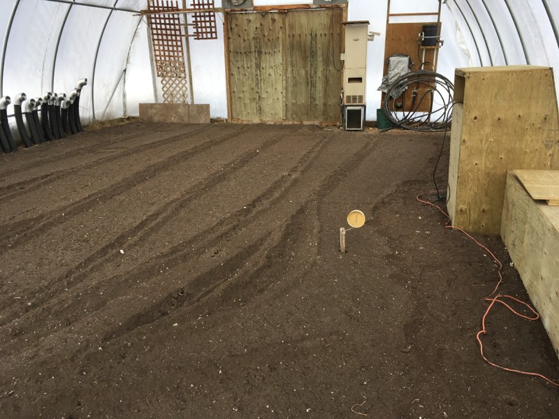 Turned on the fan in the big greenhouse. Temp was 7� F less coming out the tubes than going in. That heat is added to the soil. The 5000 cfm fan is turning on at 50� right now. Soil temp is about 25� 10" down. That's real good for this time of year.