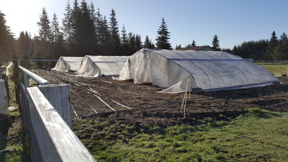 Tuesday through Thursday we had some high winds that rocked my greenhouses. I spent the last couple nights making repairs, and anchoring them down better with heavy cinder blocks at each corner. Then last night I got the end pieces of plastic on in time for today's sunshine to heat up and dry out my soil.