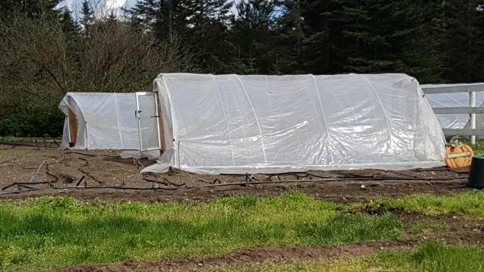 Here are her two hoop houses, complete with automatic opening windows on both ends with fans. She wasn't willing to dig soil heating cables....oh well. I choose my battles!