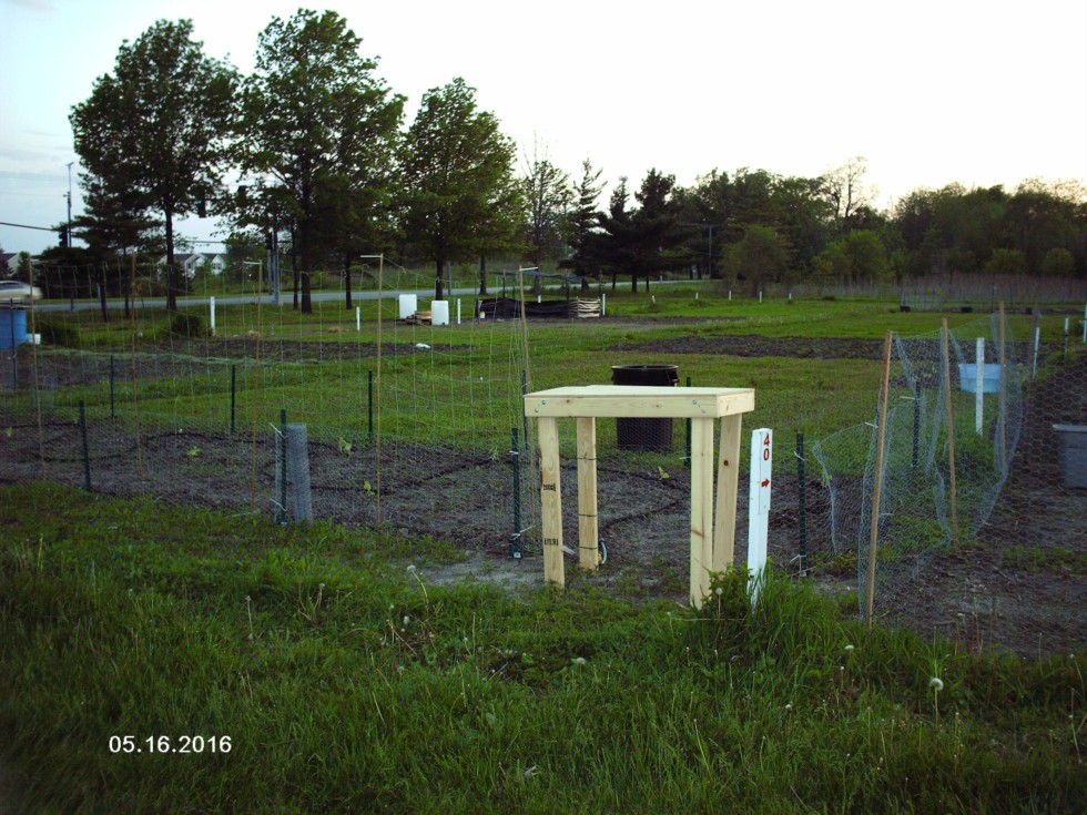 Giant squashes in the distance surrounding by silt fencing & shade cloth in our plots... Another gardener's plot in the foreground...note the table zipped tied to the fence, soaker hose waits to be connected at the base of the table...looks to be an interesting structural issue!! I'm waiting for the container of water to be placed on the table...check back soon!