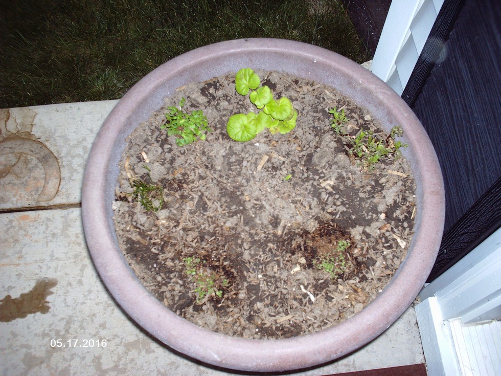 Transplanted herbs and paint box geraniums.