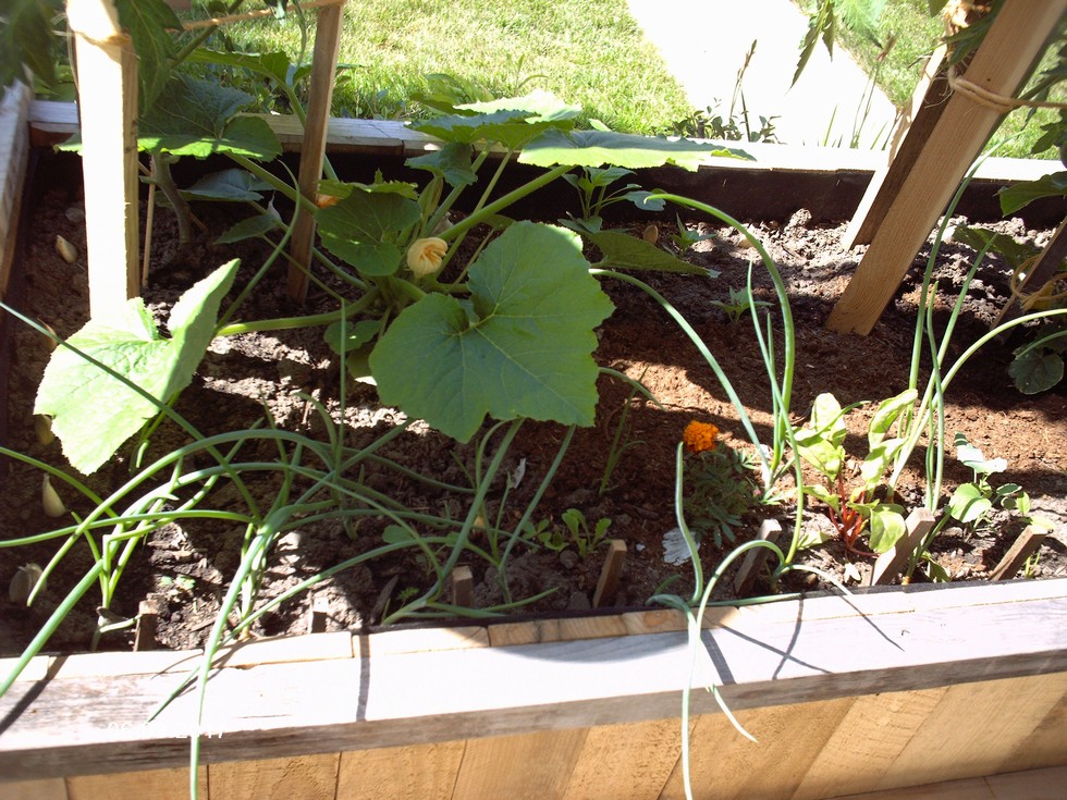 My space saver zucchini in the front grow box. Wonderful companion for the tomatoes!