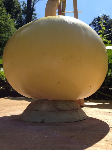 Now that the shim is "gripped" she's been slid to the right side of the cone. If you can get it to drop perfectly, you've done an amazing job, I have yet to do this. The shape is pretty much set now, and again I think the heavy side will keep winning until opposite forces change that. The focus now that it is getting heavier and larger overall is to make contact with the board with the swollen side while still maintaining the level top. I believe the round shape will hold well, and once the large side hits, it will be heavy enough to hold itself and let gravity fill the void on the opposite side.This is the main reason I made a shorter cone this year, as the longer it sits in the air, the more chance there is of becoming mis -shapen. Again, all speculation based on what I have observed in my own garden, and an experimental idea at best. Why not just grow on a board with a hole in it you ask? The cone will allow enough of a depression that it will hold the blossom up once the walls start their flat spots, allowing me an easier time of moving and displaying without further worry it will break. Conversely, the taller cone last year kept the rounded side walls going without the top sagging, so the shorter cone may induce a blocker shape after hitting the board rather than floating... time will tell. Another reason for shifting back to the right was to allow a little more room on that bent blossom.
