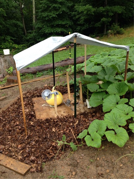 Hopefully this will do the trick for, oh, at least until Monday when I get back from a long weekend. A larger 6 x 6 shade tarp and a bit of leaf litter near the platform to help control splash. Fan on top, fan on bottom, powder everywhere it seems :) Going down swingin on this one!