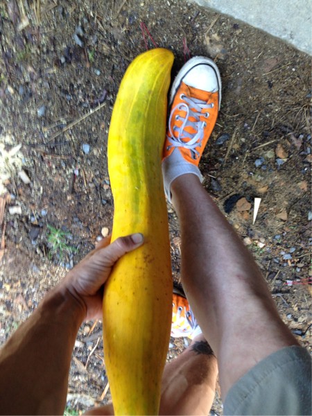 Lol, either my cucumbers are big, or I'm just a tiny dude. Roughly same size as leg from foot to knee. Plant is about 4' tall x 2' wide, new cuke set at terminal tip 2 days ago.