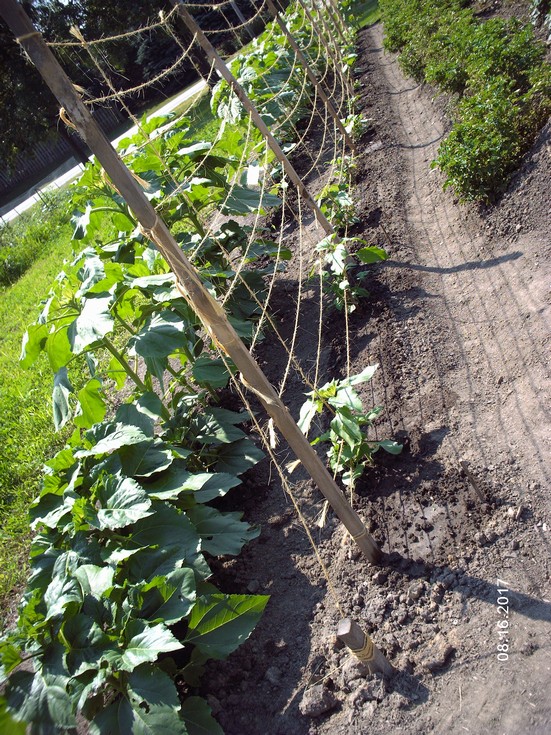 Update on the Anasazi Beans! Also, finished the vertical strings on the trellis. Fed seaweed and calcium to potatoes which are heavily flowering! Mounds are rising and cracking open. Cracks were closed to prevent sunlight damage to tubers.