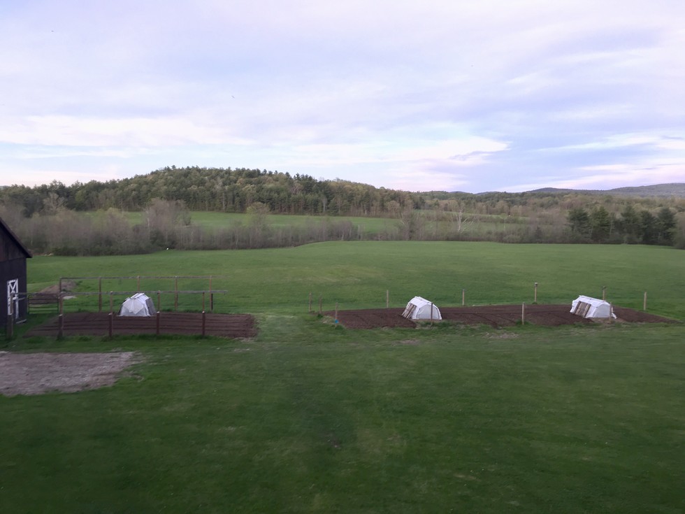 Pumpkins planted in their patch with huts for weather protection. (1,000 sq ft each patch)
