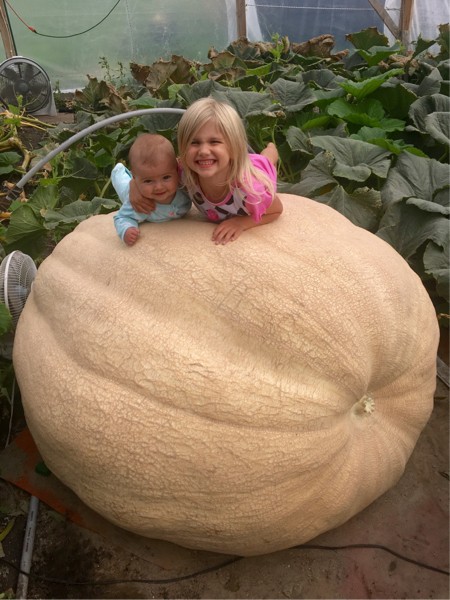Briar and Blake on their pumpkin! 81dap 1742 Wolf x self. It�s not going to get as big as last years, but it looks and feels like a rock! Still growing around 8 pounds a day