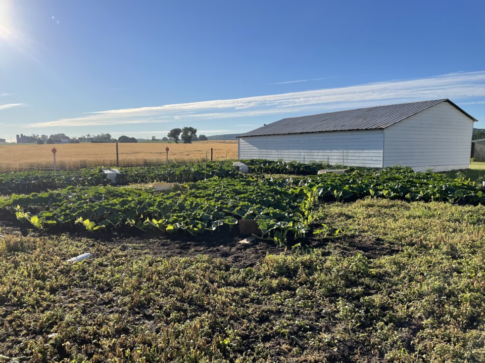 Four (4) plants growing this year. This photo was taken on June 28th. The plant appearing closest is a 1760 Uhlmeyer, planted 2 weeks after the others. It caught up quickly, but had some issues with pollination, a split main vine, and now has some stump issues as well. It has a pumpkin pollinated 7/4 that's growing and the plant is still hanging on though I don't know for how long. All the other plants have been free of trouble so far - knock on wood.