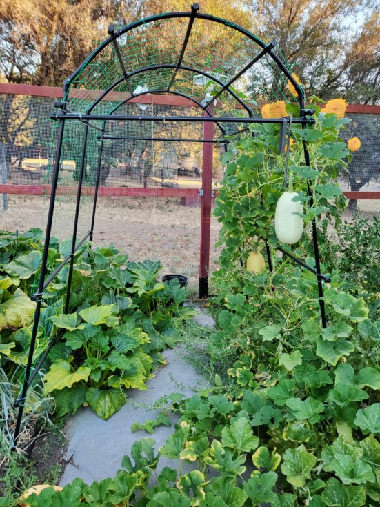 Those are spaghetti squash that are hanging on the trellis. They seem to be getting bigger than the ones growing on the ground.