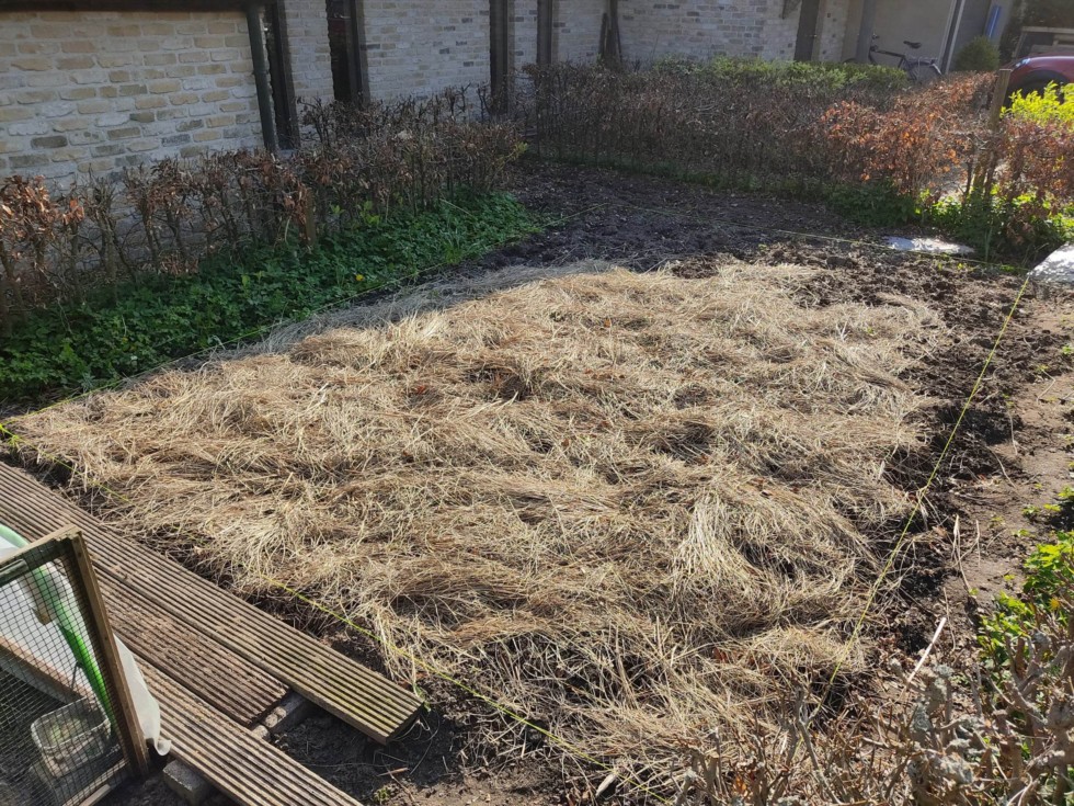 The patch for the 150 square foot challenge which measures 3 x 4.65 m. Temporary covered the soil to keep the soil moist and block some weeds. I'll try to grow it completely organic. I'm probably going to grow 1266 Molek