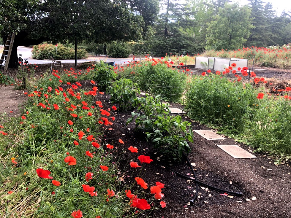 PeekaBoo � Hidden between rows of Flanders Poppies my heirloom tomatoes are really taking off. My little giants are in the transparent cages on the upper right...
