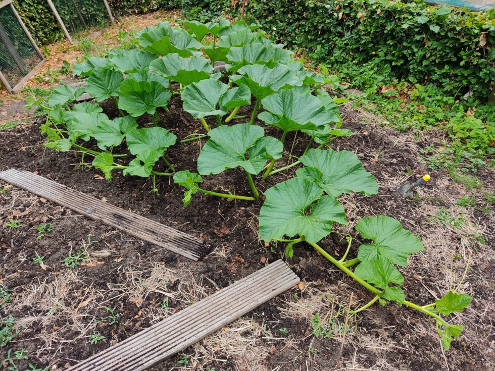 The 1243 Molek plant is doing well in the 150 sq ft patch. The first pumpkin is still 4 leaves deep in the tip with about 22 secondaries in front so the space for backups is very small.
