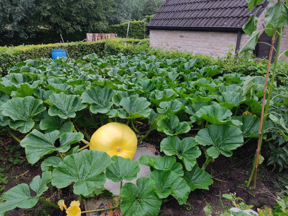 The 150 sq ft pumpkin is doing well at 25 DAP. Everything is still organic without spraying anything on the leaves.