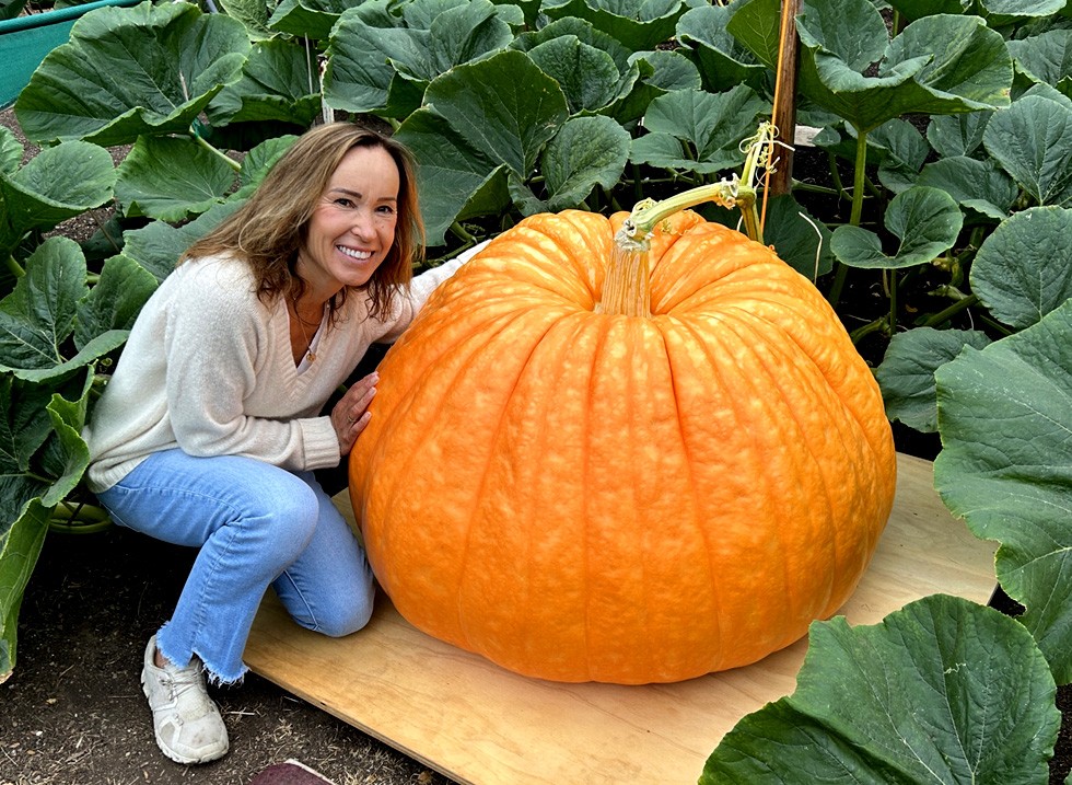 Patch Hugs � Batina gives her pumpkin, Pliny the Younger (1552 Young x 1634 Rea) a hug of encouragement. The plant has lost the stump so he�s now connected to a single side vine with only a few tertiaries. Now taping 258� OTT at 45 days, he�s only moving 5 pounds a day...