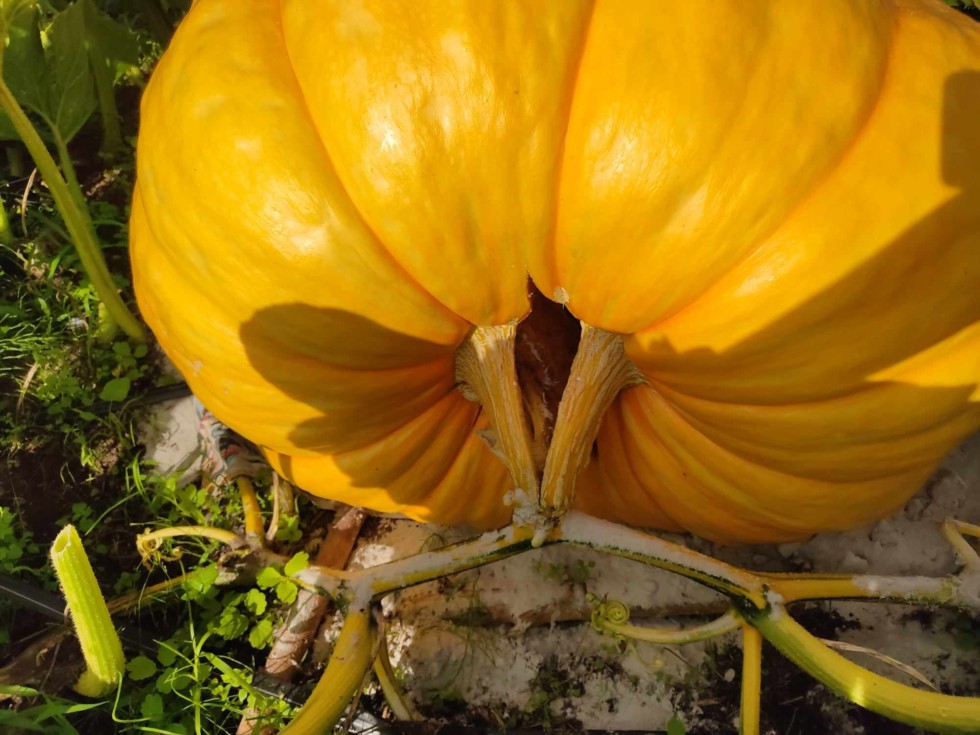 Unfortunately the 150 sq ft pumpkin had a stem split some weeks ago. I tried to save it but 10 days after the split appeared, it reached the cavity. The good thing is that i've learnt a lot and only lost a small pumpkin.