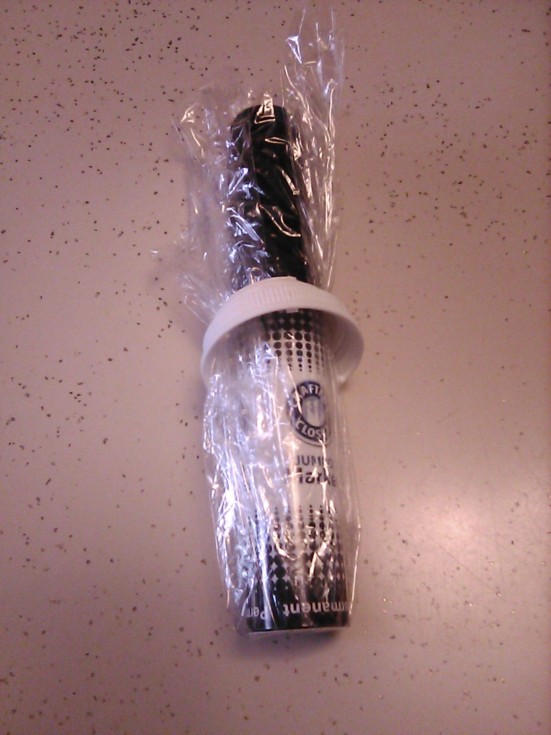 Here's the method I used for when I wanted to create a 'balloon' top for the prescription bottle; Some Giant Magic Marker from Dollar General and I carved out the inner material of the bottle cap. Lucky I have fingers left, lol. Then, simply shoving the Saran Wrap up through and using the 'neck' of the marker, I was able to use my box cutter to just go around it and cut it off, to-size. 4-5 more and I'll be good at it, lol. eg