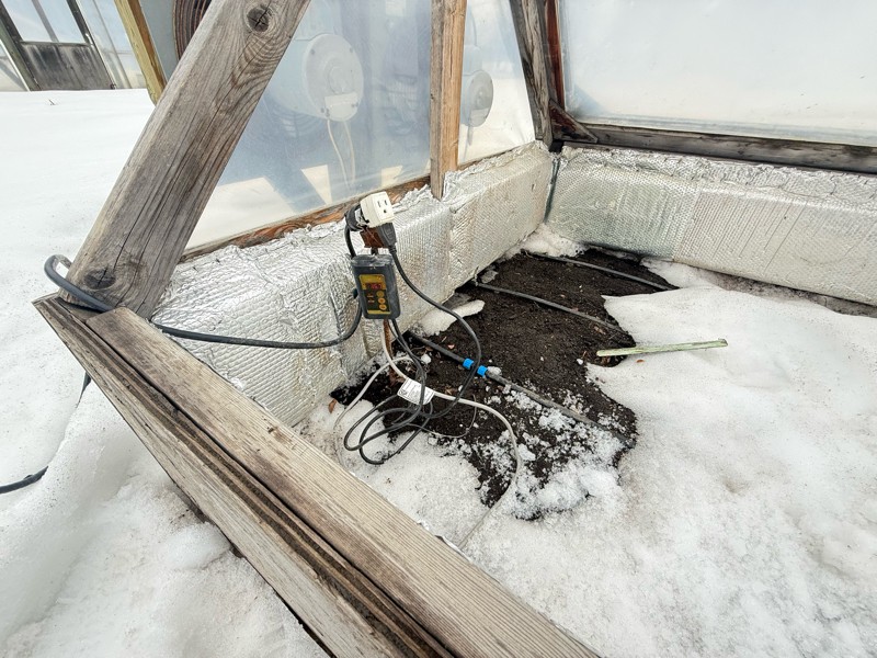 The melon shack cable warmed up enough soil that I could install the probe and thermostat. Still have 16" of snow in the rest of the patch. Just need some warm weather.